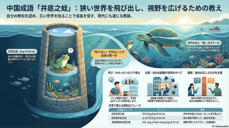 井底之蛙(jǐng dǐ zhī wā)=「井戸のカエル」のように、自分の狭い世界がすべてだと思い込まないこと。視野を広げるには、外に出て、違う意見に耳を傾ける勇気が必要ということです。「知らない」を知ることが、成長の第一歩ですね。