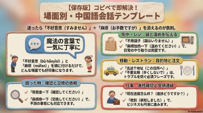 これで全10場面+万能フレーズの完成です。どの場面でも「不好意思」と「麻烦」を入れるだけで、自然と丁寧な中国語になります。
