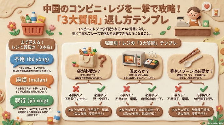 場面別・中国語 会話テンプレ10【第1回】コンビニ・レジ編:袋・箸・温め…「レジの3大質問」を一撃で返す